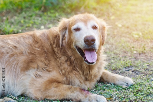 Friendly golden retriever dog is lay down and relaxing in the garden