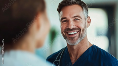 Friendly male doctor wearing blue scrubs and a stethoscope, smiling warmly during a conversation with a blurred patient in a bright clinical setting