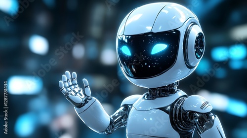 Friendly robot waving in city background