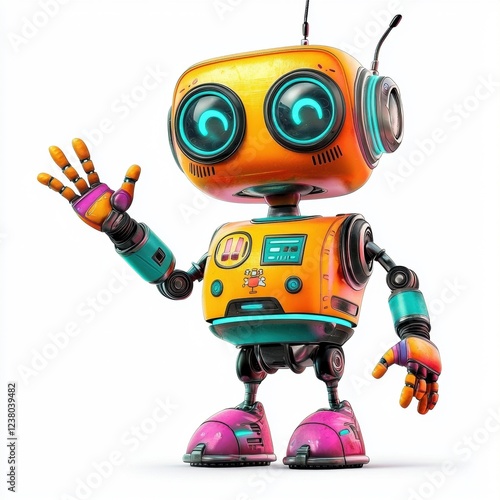 friendly robot with antennae, colorful details, and a waving gesture, placed on a bright white background