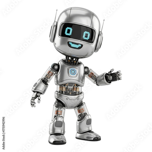 Friendly Silver Robot, Futuristic Design, Presenting, Cheerful AI, Technology Concept, Isolated on Black Background