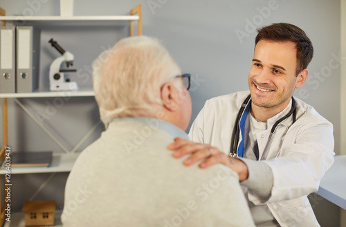 Friendly smiling male doctor comforting patient during consultation in medical office. Caring physician or cardiologist offering support and understanding, cheering senior man up during checkup.