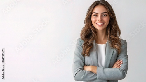 Friendly Young Businesswoman in Casual Outfit Smiling and Standing Against Neutral Background, Radiating Confidence and Approachability for Professional Use