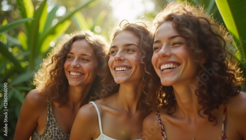 Friends celebrate summer getaway in lush tropical setting with laughter and smiles amidst vibrant greenery. Tropics are climatic zones of Earth in which Sun is at its zenith at least once year. AI.