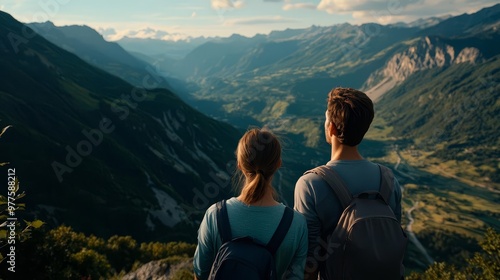 Friends looking out over a mountain valley during their vacation, flat design, top view, scenic view theme, 3D render, Triadic Color Scheme