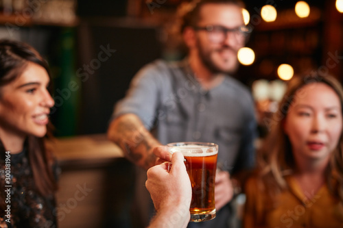 Friends standing in bar and toasting with beer.