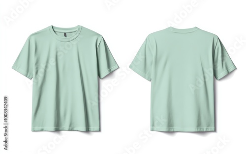 Front and back view mockup of a plain pastel pink tshirt on a white background, displayed side by side, smooth texture, realistic shadow effects, minimalistic design, sharp edges