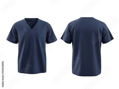 Front and back view of a blank navy blue v-neck t-shirt isolated on a transparent background, PNG