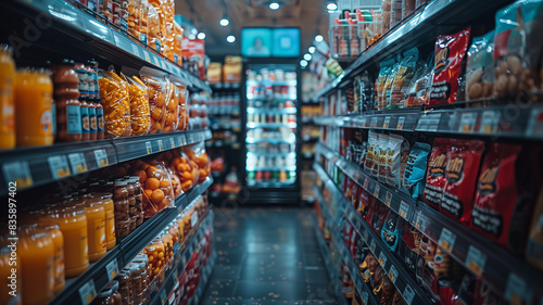 front perspective, blurred grocery shelves, food articles semi visible, a topping layer of technological lines and tech vibe.generative ai