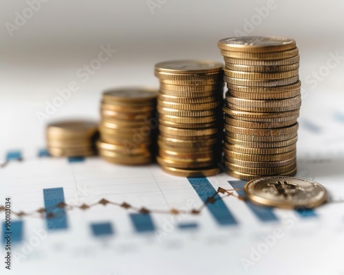 Front shot of stacked coins with rising graph, positive trend, business marketing, white background