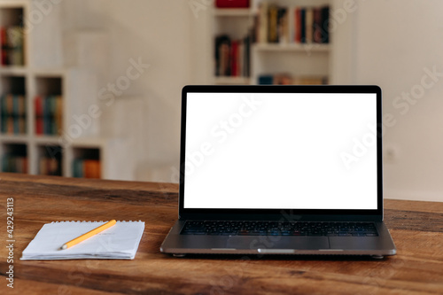 Front view at a laptop screen with an empty white screen for your presentation stands on a wooden table, notebook lies nearby. Mockup, copy space concept