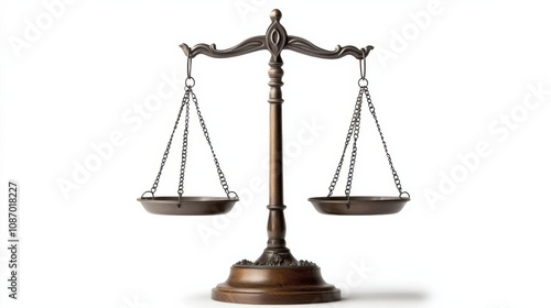 Front view of a balanced legal scale on a white background, with shadows adding depth to the composition