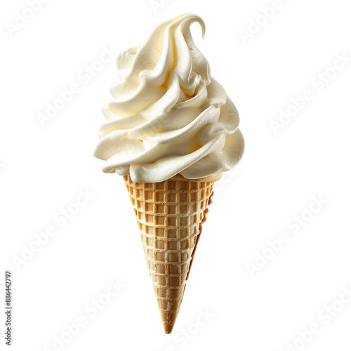 Front view of a delicious looking vanilla softee swirl in a waffle cone levitating in the mid-air isolated on a white transparent background