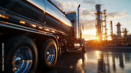 Front view of a rugged vacuum tanker truck parked at an oil refinery, the chrome tank gleaming under the harsh sunlight, pipelines visible in the background