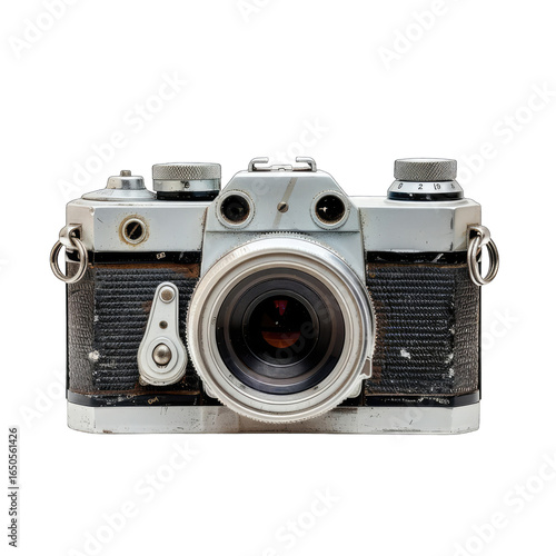 Front view of a vintage 35mm camera. Gray/white body, dark gray textured parts. Round lens, controls visible. Evidence of age and use