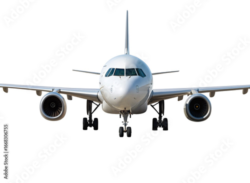 Front view of commercial airplane against black background isolated with jet engines detailed
