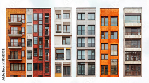 Front view of sleek, modern office buildings with glass facades. Urban architectural design with vertical emphasis. Caption space on the side for business, corporate, or real estate use.
