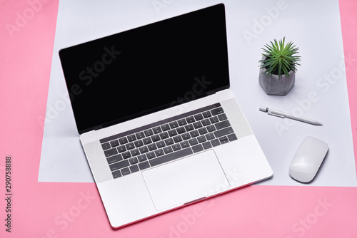 Front view of the laptop is on the work table, concrete background, clipping path inside