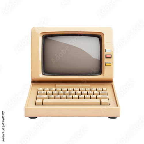Front view of vintage beige retro computer with CRT monitor and classic keyboard. Retro style personal computer isolated on transparent background Nostalgia concept for early computer technology