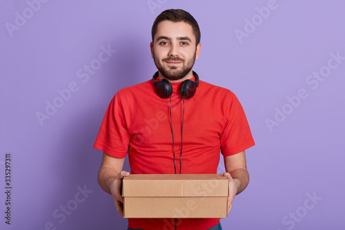 Front view of young delivery man with carton box in hands, posing isolated over lilac studio background, having headphones around neck, wearing red casual t shirt, looks at camera. Delivery concept.