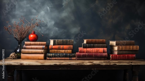 Front view pile of books on minimalistic background or stock of books for world book day background