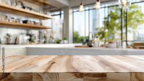 frontal view shot of empty table in living room, white blurred living room with tv and furniture in the background