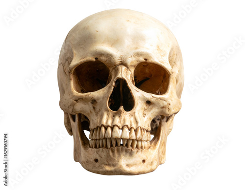 Front-Facing Human Skull in High-Contrast Black and White, Isolated on Transparent Background PNG