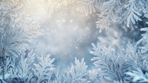 Frost Formations on Winter Branches with Glittering Snowflakes and Soft Sunlight