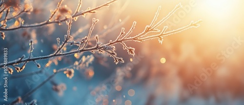 Frost-covered branches illuminated by warm sunlight during a serene winter morning