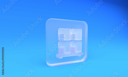 Frosted glass Cardboard boxes on pallet icon isolated on blue background. Closed carton delivery packaging box with fragile signs. Square frosted glass button. 3D render illustration