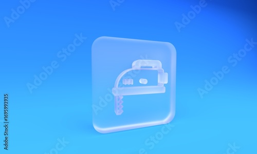 Frosted glass Electric jigsaw with steel sharp blade icon isolated on blue background. Power tool for woodwork. Square frosted glass button. 3D render illustration