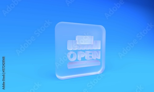 Frosted glass Shopping building or market store and text open icon isolated on blue background. Shop construction. Square frosted glass button. 3D render illustration