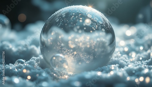 Frosted glass-like bubbles suspended within an iridescent mist-filled orb, surrounded by delicate droplets of crystal clear water.