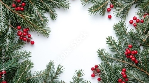 Frosted Pine Branches with Red Berries Bordering a White Background