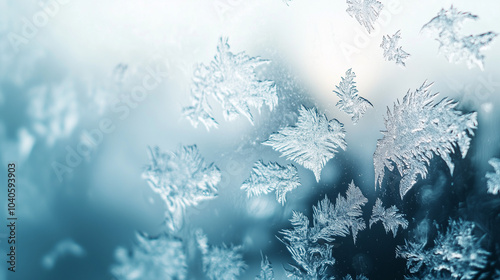Frosted window with intricate ice crystals and soft winter light
