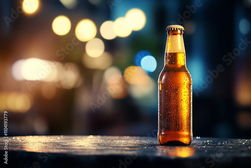 Frosty beer bottle on a modern stone table, surrounded by soft ambient light