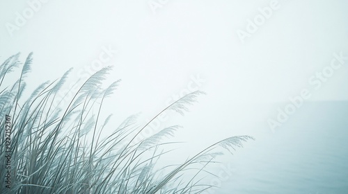 Frosty pampas grass sways in misty field, serene winter landscape, website background