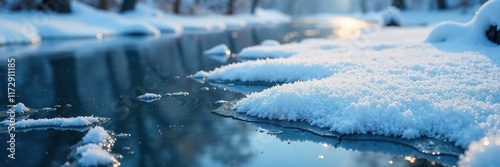 Frosty river surface with cracks ice and delicate snowflakes, frost, snowflake
