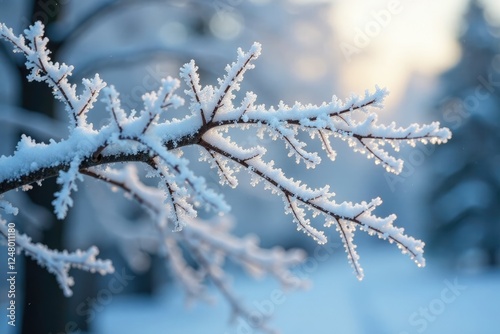 Frosty snow-covered tree branches with intricate ice crystals, lacy, delicate, wintry