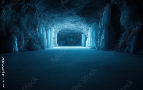 Frozen Depths: A vast dark cave with icy blue rock formations rising from both sides, creating a chilling atmosphere.