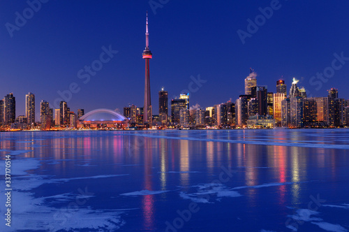 Frozen ice covered Lake Ontario reflecting the lights of Toronto city skyline at dusk