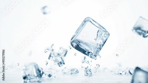 Frozen ice cube dropping, isolated on white background, with full depth of field.