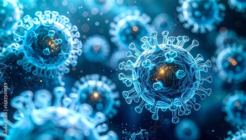 Frozen microbial structures in icy cyan and frosted white hues, glowing particles inside, futuristic medical abstract science visualization in macro detail.