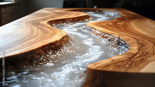 Frozen river-themed epoxy resin on a wooden table, with clear resin mimicking frozen water, embedded with white and silver particles resembling ice, resin flowing smoothly with the wood grain,