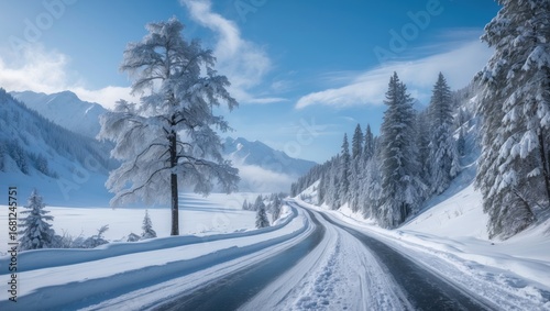 Frozen roadway navigating the rugged mountain terrain during winter