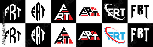 FRT letter logo design in six style. FRT polygon, circle, triangle, hexagon, flat and simple style with black and white color variation letter logo set in one artboard. FRT minimalist and classic logo