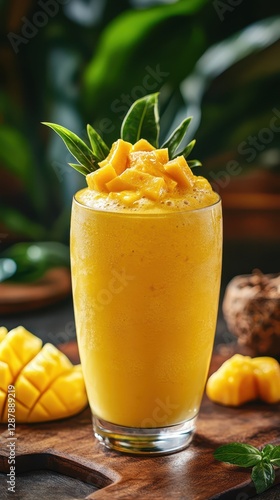 Fruit smoothie beverage wellness trend concept. A vibrant mango smoothie topped with fresh mango pieces and leaves, served in a tall glass, surrounded by tropical greenery.