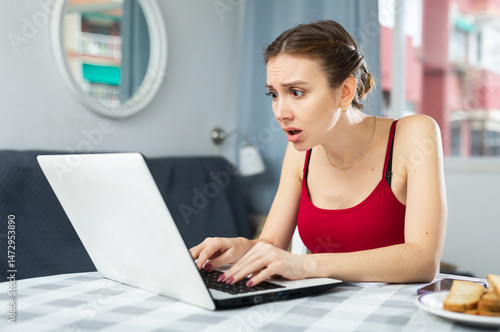 Frustrated woman sitting at table in apartment and using laptop.