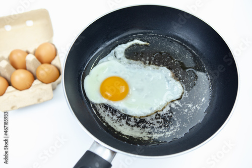 Fry eggs in an old pan and there are a number of eggs in a box on a white background.
