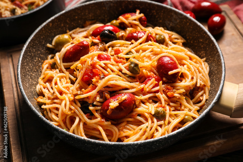 Frying pan of tasty Pasta Puttanesca on table